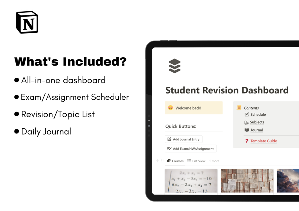 The Notion Student Revision Dashboard is an "All-in-one dashboard" designed to help you plan your revision using Notion.